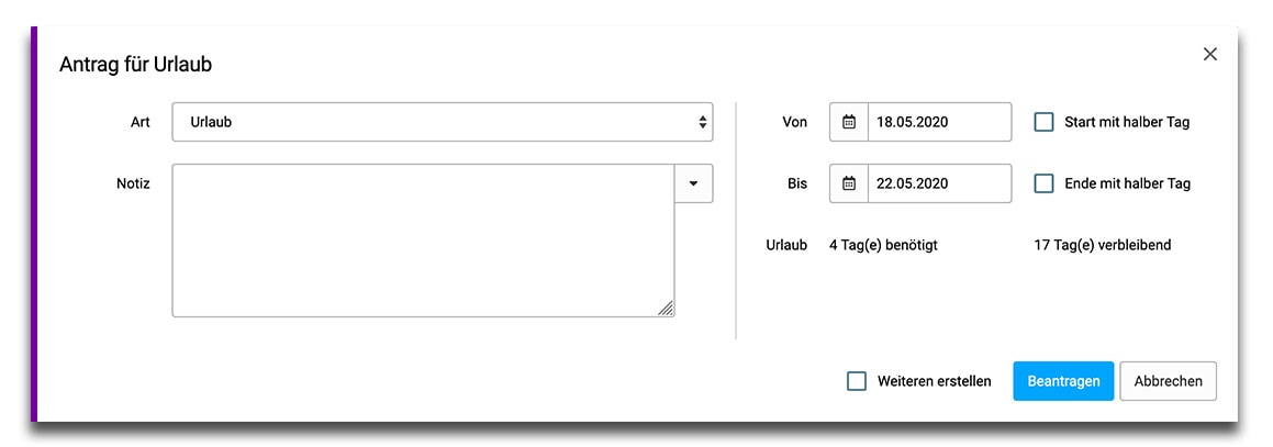 Dank automatischen Benachrichtigungen, einer übersichtlichen Kalenderansicht und einem stets aktuellen Überblick über Urlaubsstände behalten sowohl Arbeitnehmer als auch Arbeitgeber stets den Überblick und haben die Urlaubsplanung im Griff.