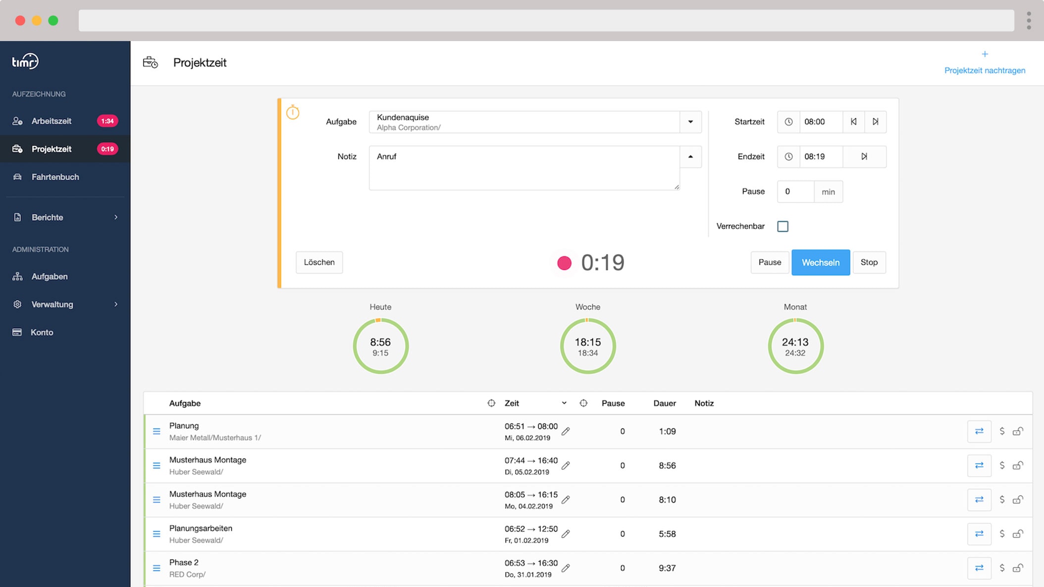 Jetzt ist es möglich zum Beispiel nach „Huber Montage“ zu suchen. Damit wird nur diese Aufgabe angezeigt. In den timr Apps besteht diese Möglichkeit bereits seit Längerem.