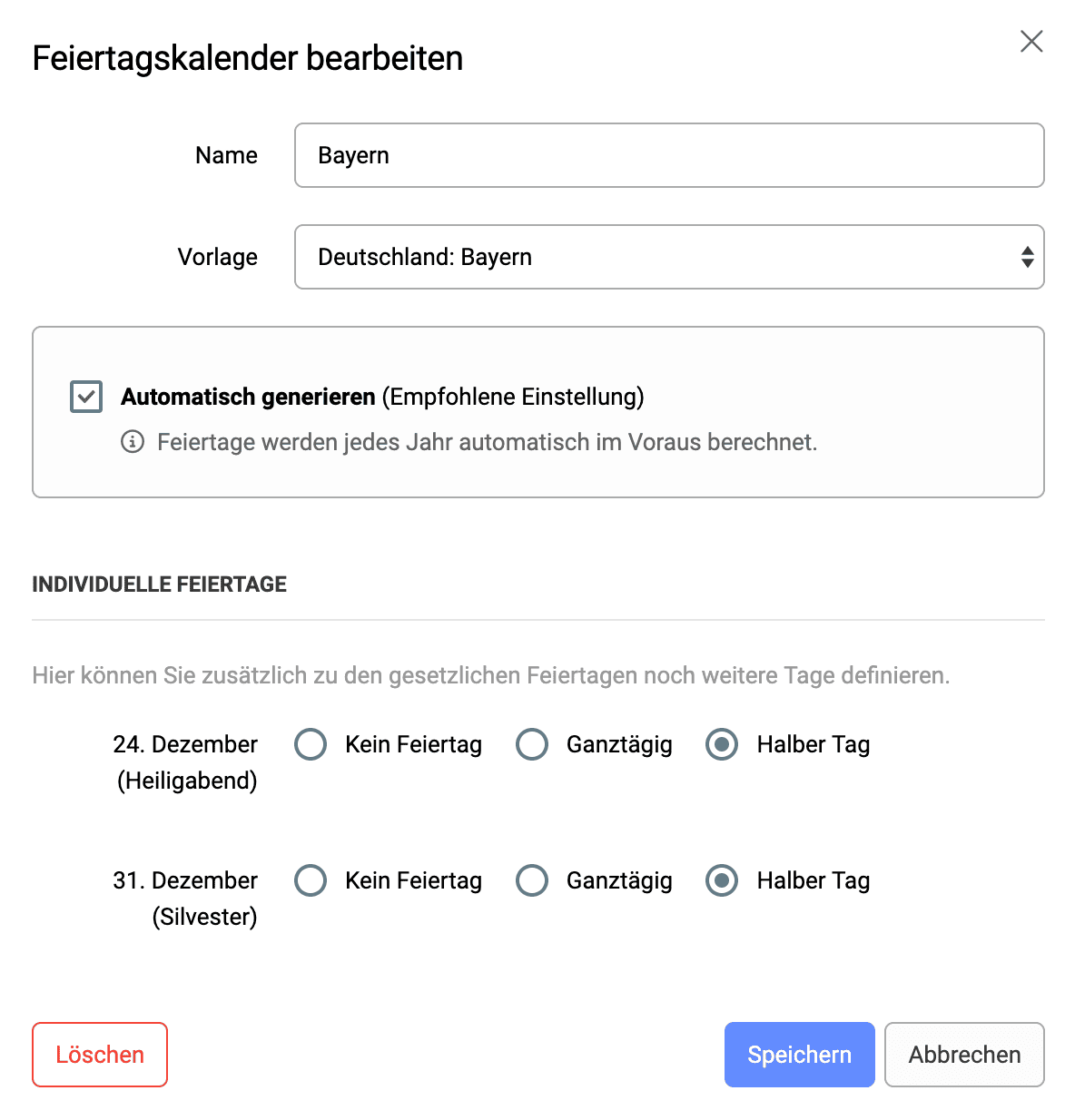 Sie können jetzt einstellen, dass die Feiertage für das Folgejahr automatisch generiert werden. Die neue Option ist beim Erstellen oder Bearbeiten eines Feiertagskalenders verfügbar. So stellen Sie sicher, dass alle Feiertage rechtzeitig im System sind – ohne manuelles Zutun.