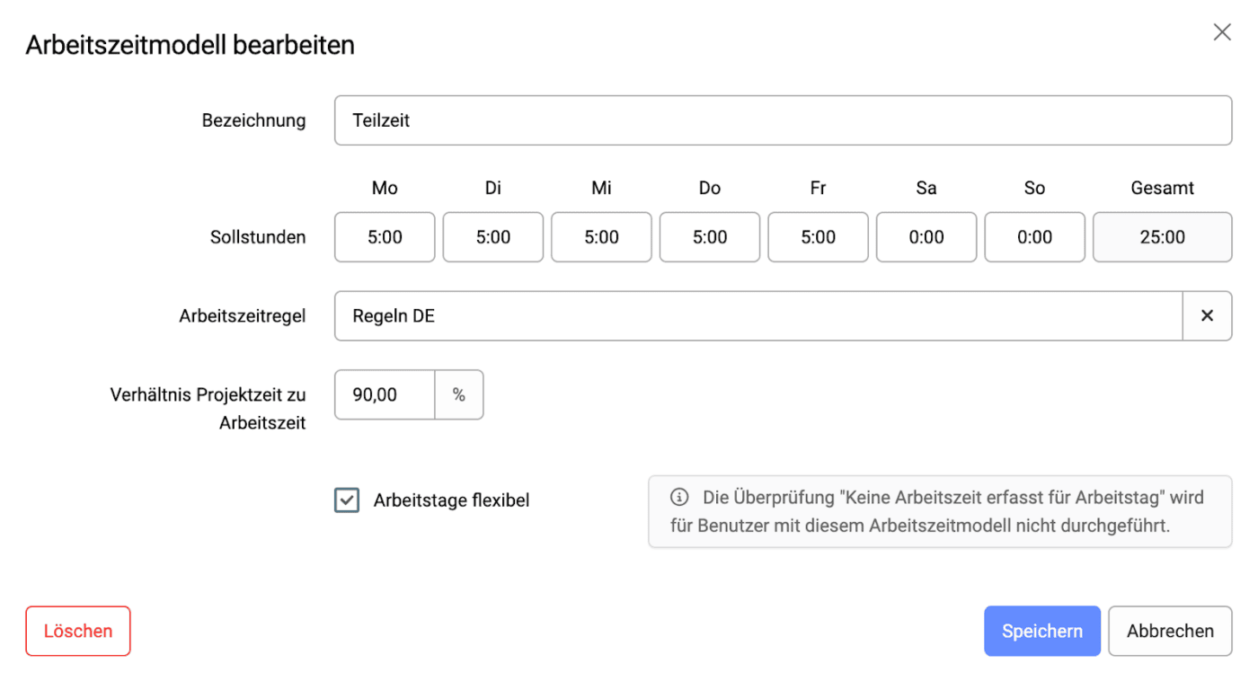 Mit der Option „Arbeitstage flexibel“ prüft timr nicht mehr, ob montags, dienstags oder mittwochs gebucht wurde – sondern nur, ob das Wochensoll erfüllt ist.