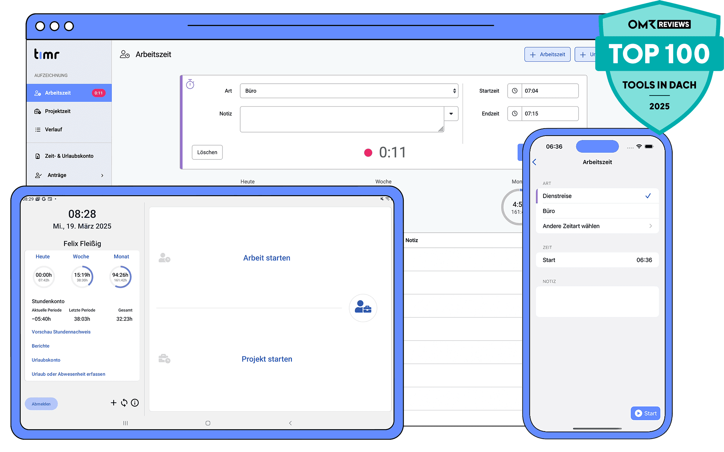 Mit timr verwalten Sie Urlaubsanträge und Abwesenheiten digital – ohne Excel, ohne Formulare, ohne Aufwand. Alles zentral, transparent und in Echtzeit – im Web und in der App.