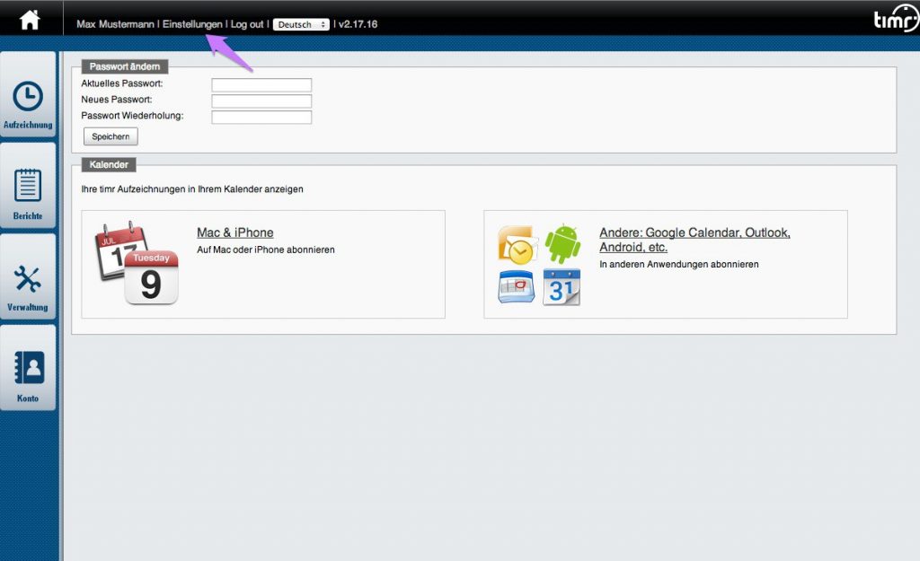 Um die Zeiteinträge in Ihrem Kalendar anzuzeigen klicken Sie auf “Einstellungen” und wählen Sie den Kalendar aus. Sie bekommen im Anschluss eine detaillierte Anleitung zum Anzeigen Ihrer Daten in dem gewünschten Kalendar.