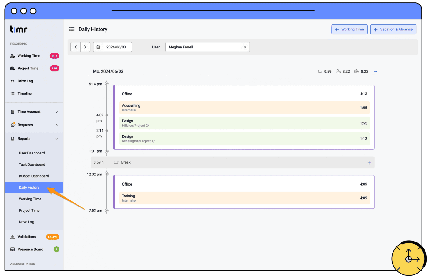 The “Timeline” view not only gives you an improved overview of your recorded times, but also allows you to enter forgotten times at any time if there is a gap in your timeline.
