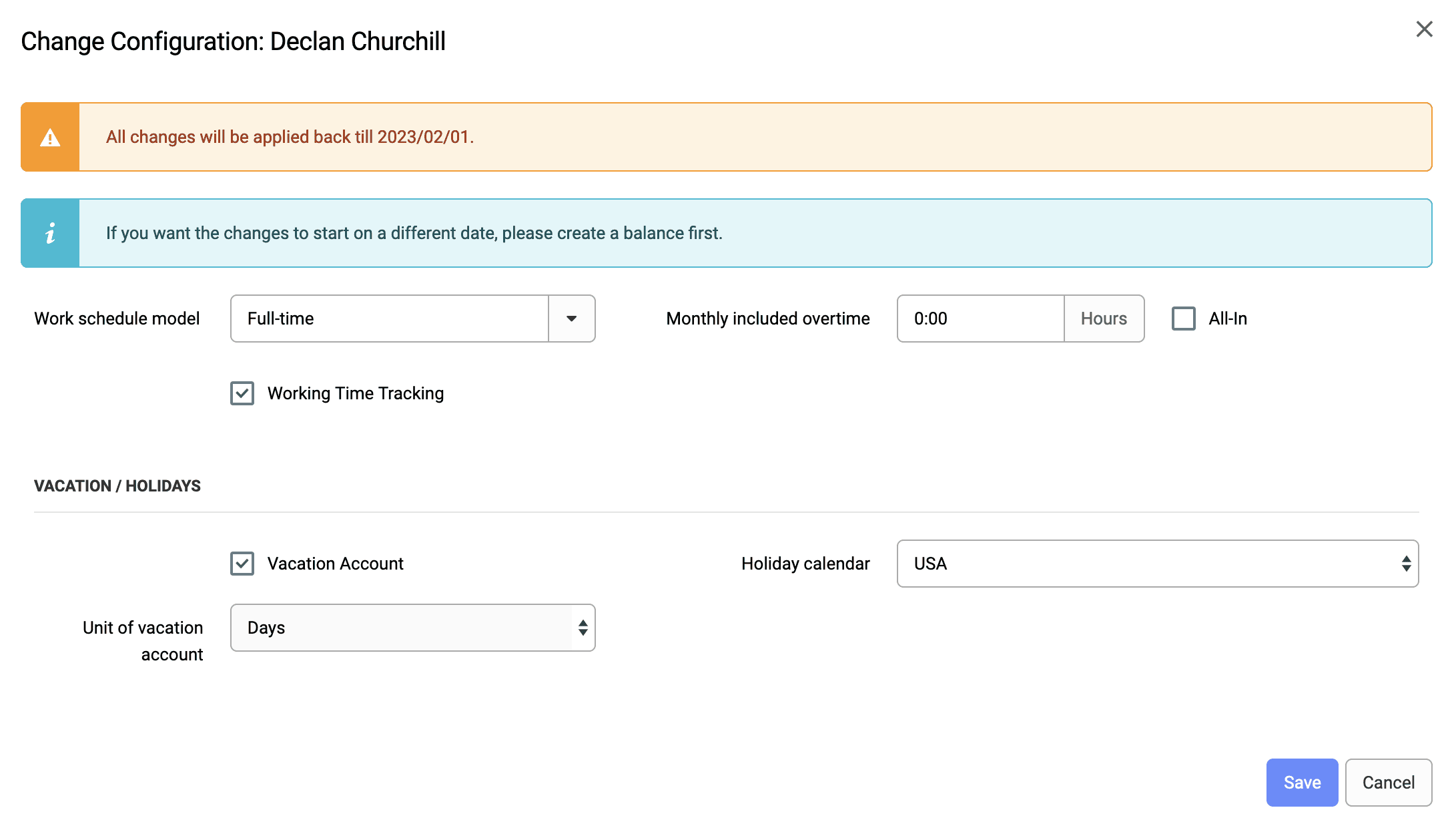 With the new editing function directly in the time & vacation account, you can now adjust working time settings quickly and easily. Whether you want to change the working time model or adjust the monthly overtime allowance – all this is now possible directly in the time account without having to switch to the user administration.