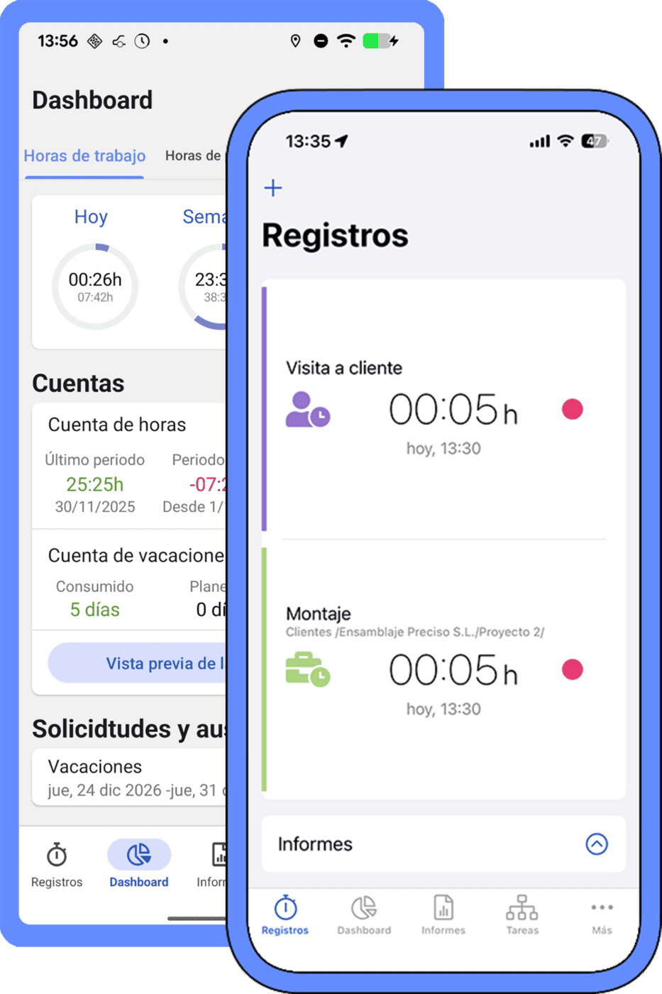 Todos los tiempos registrados están disponibles en tiempo real, lo que le permite saber en todo momento de forma rápida y sencilla en qué se ha invertido el tiempo de trabajo.