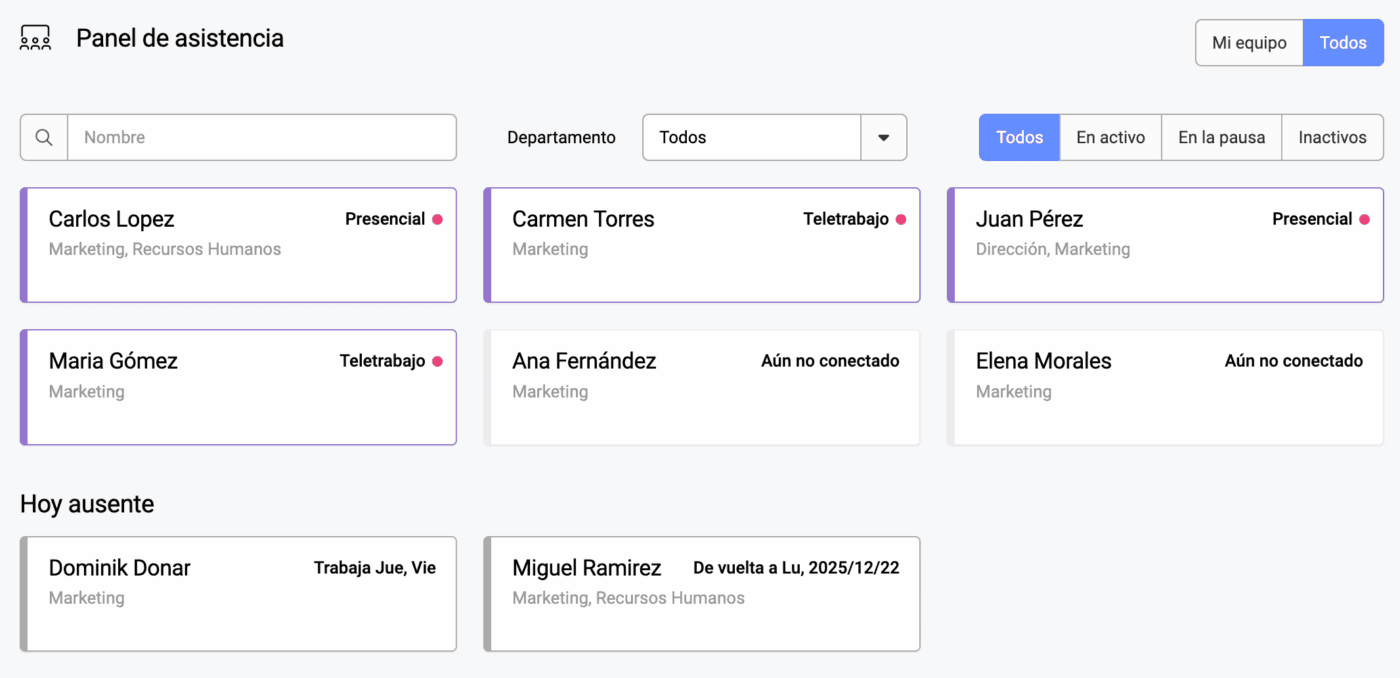Consulte quién está trabajando, qué tareas se están llevando a cabo y quién se encuentra ausente.