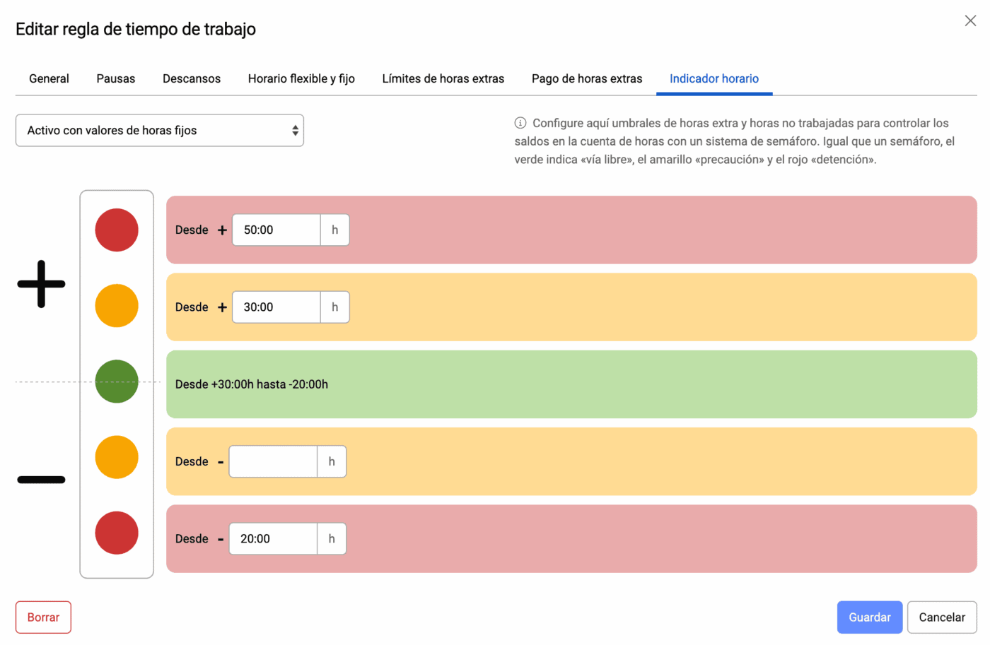 Con la cuenta semáforo de timr, puede definir límites tanto para las horas extra como para las horas en negativo.