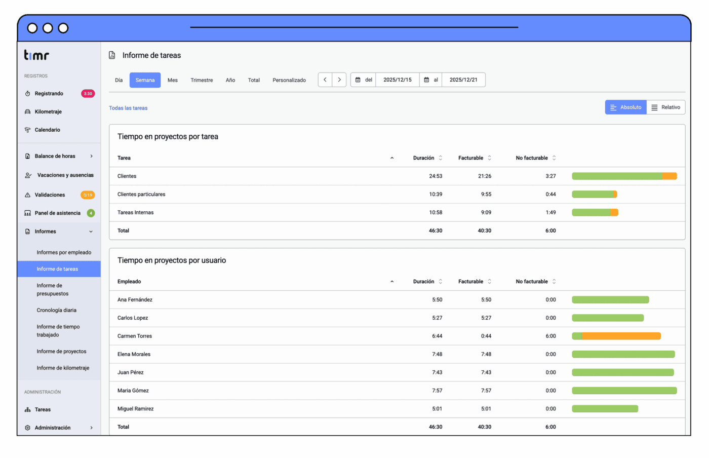 Registro del tiempo de trabajo para encargos y proyectos
