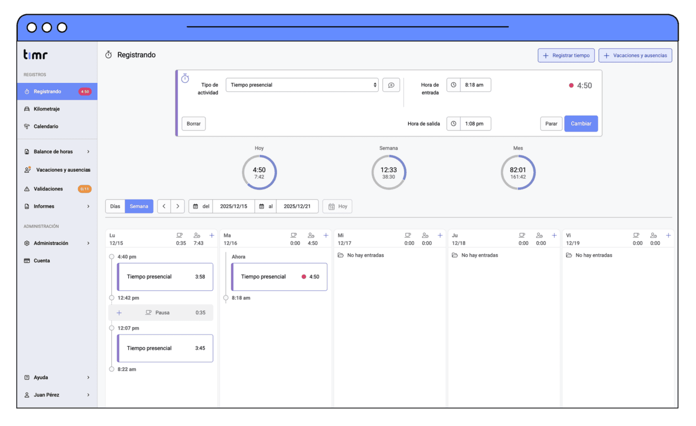 timr garantiza un registro del tiempo conforme a la legislación vigente, cumpliendo con todos los requisitos legales. De este modo, evita errores y asegura que su empresa se mantenga siempre dentro del marco normativo.