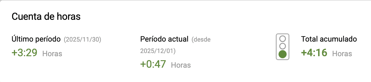 Cada empleado tiene acceso en todo momento a su saldo actual de horas y vacaciones.