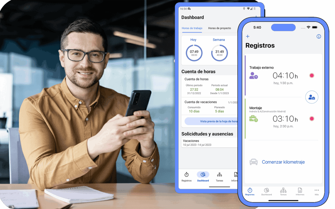 Sus empleados pueden registrar sus tiempos de trabajo y de proyecto directamente desde su smartphone. Además, la app ofrece acceso inmediato a informes de horas trabajadas, saldos de vacaciones y ausencias.