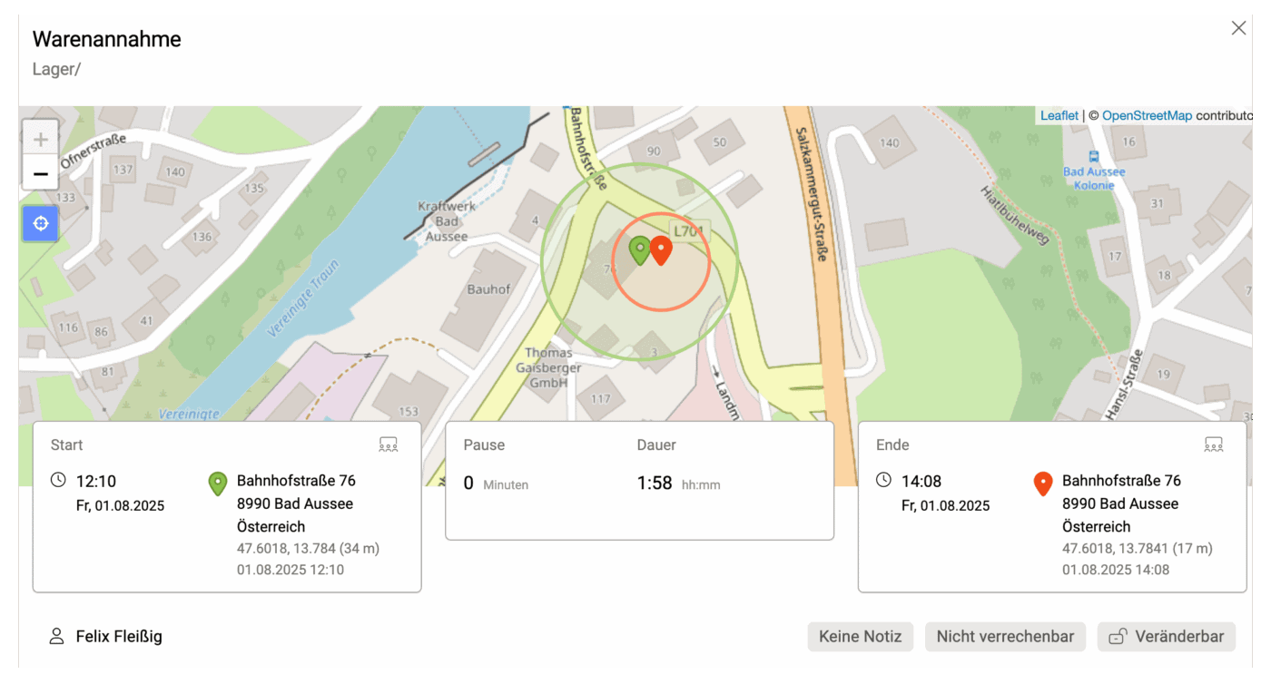Con timr, puede activar el registro opcional de la ubicación al fichar. Esto le permite documentar con precisión dónde se ha realizado cada actividad.