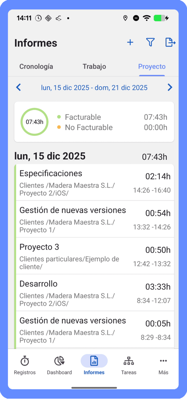Gracias a filtros inteligentes, puede seleccionar exactamente los clientes, proyectos o tareas que desea analizar y visualizar la información relevante al instante.
