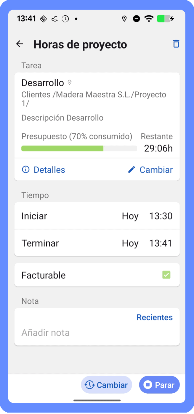 Sí. La app de timr funciona incluso sin conexión a Internet. Todos los tiempos registrados se guardan localmente y se sincronizan automáticamente en cuanto el dispositivo vuelve a tener conexión.