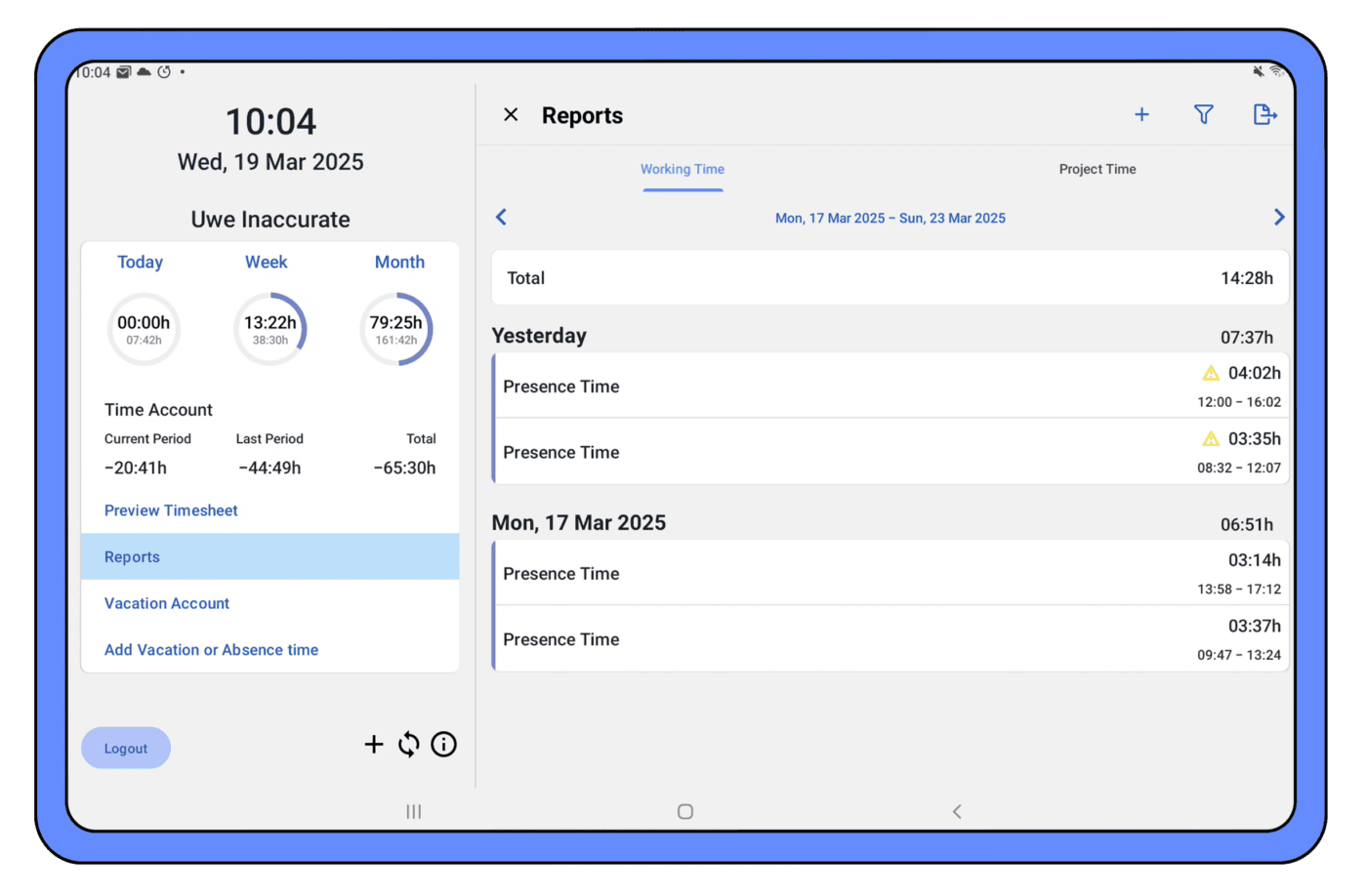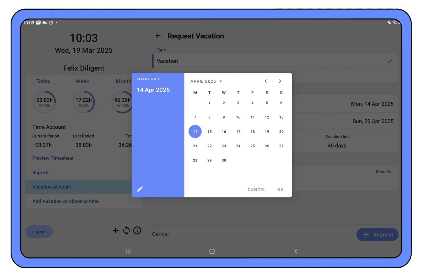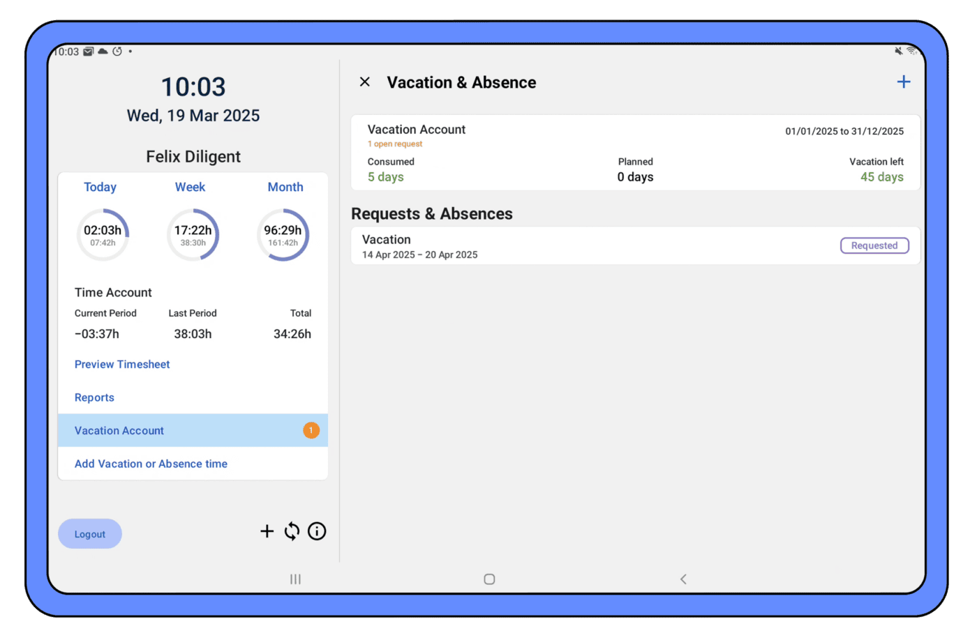 La app del terminal de timr ofrece funciones adicionales: los empleados pueden consultar su saldo de horas, solicitar vacaciones y ver los días disponibles directamente desde el dispositivo.
