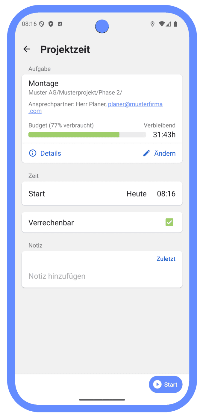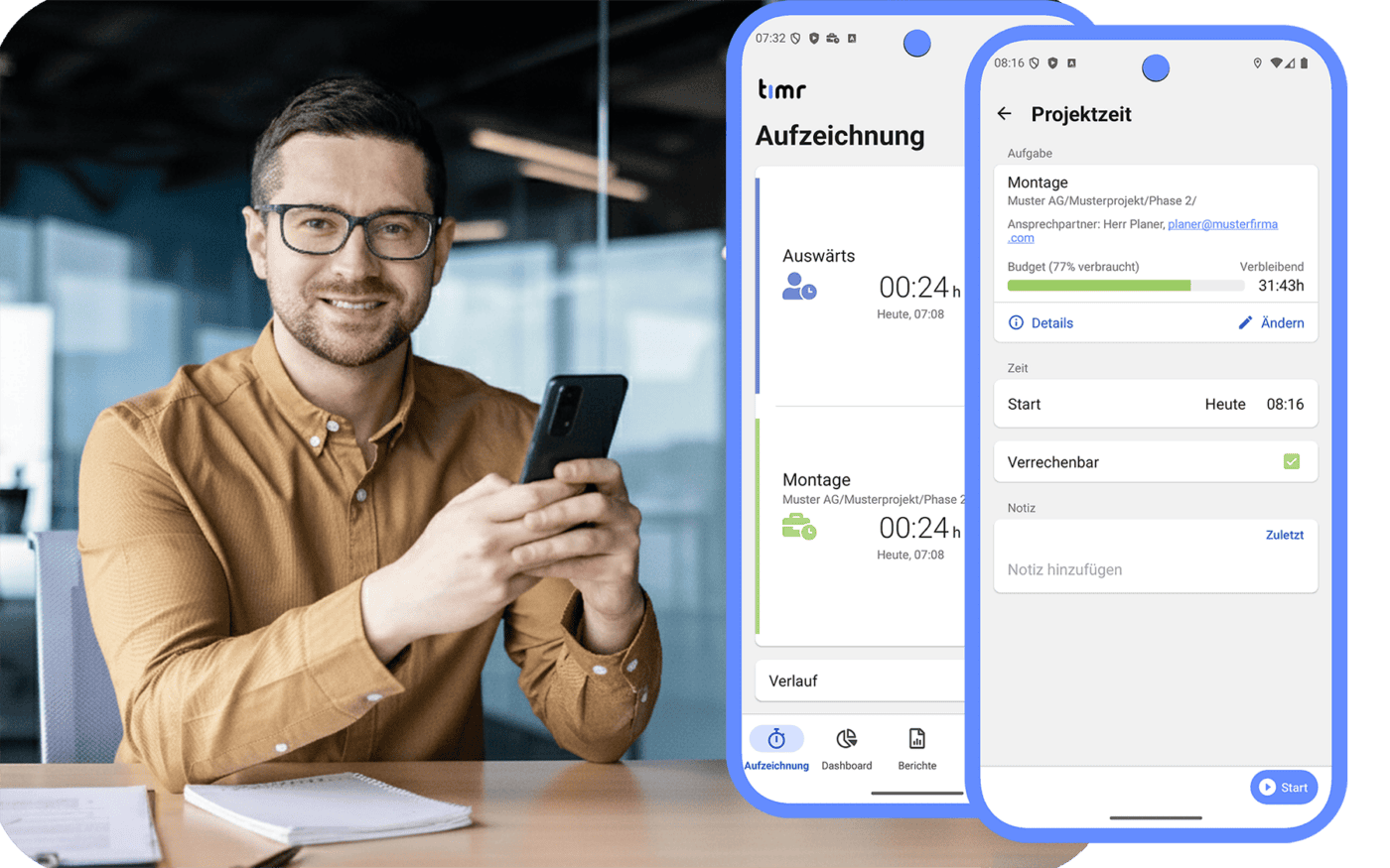 Egal ob beim Kunden oder unterwegs im Einsatz: Ihre Mitarbeiter erfassen Projektzeiten direkt am Smartphone in der timr Android App. So sind alle geleisteten Projektstunden dokumentiert, was Sie als verlässliche Grundlage für Abrechnungen verwenden können.