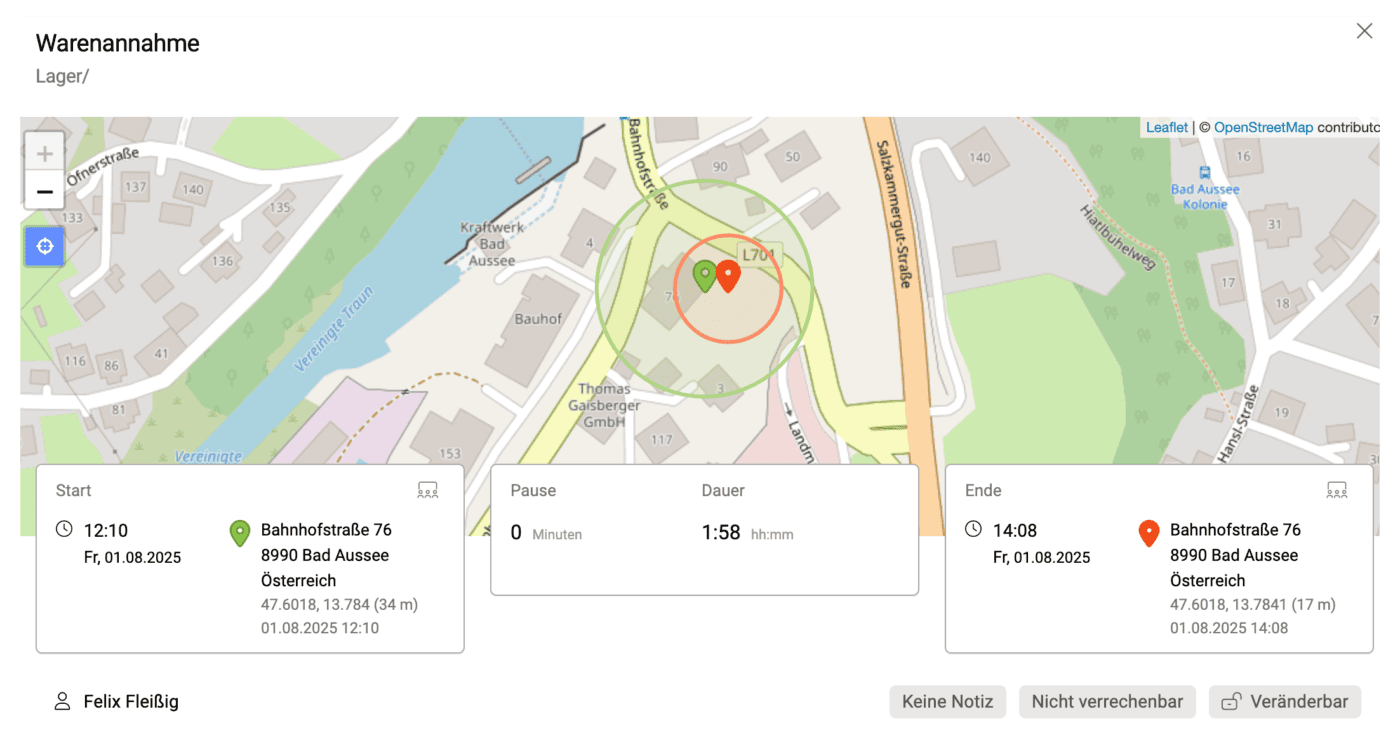 Mit timr lassen sich auch Arbeitszeiten mit genauer Ortsangabe dokumentieren oder auf einen bestimmten Standort mit begrenztem Radius beschränken. Das sorgt für transparente Nachweise gegenüber Kunden und verhindert fehlerhafte Einträge.