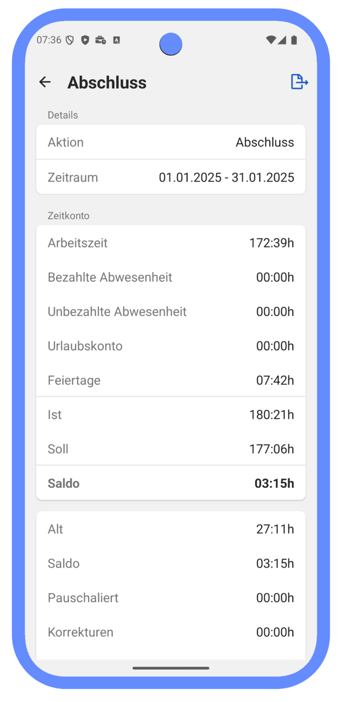 Alle Mitarbeiter haben immer ihren aktuellen Stundennachweis am Handy dabei. So behalten sie jederzeit den Überblick über ihre bisher geleisteten Stunden und den noch verfügbaren Urlaub.