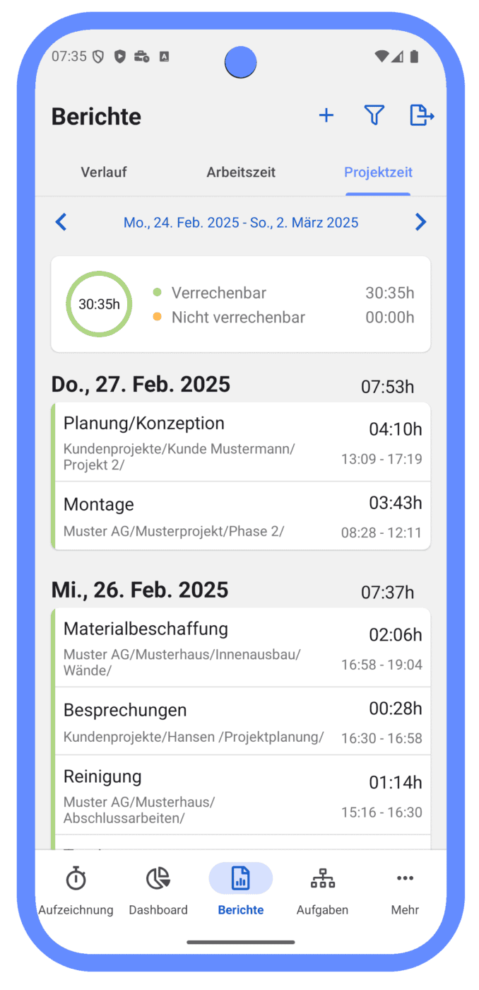 Mit der timr App für Android werten Sie Projektdaten auch unterwegs aus und erstellen Berichte direkt vor Ort – z. B. für Kundenprojekte. Dank praktischer Filter lassen sich gezielt Kunden, Projekte oder Aufgaben auswählen, sodass Sie genau die Informationen sehen, die Sie gerade brauchen.