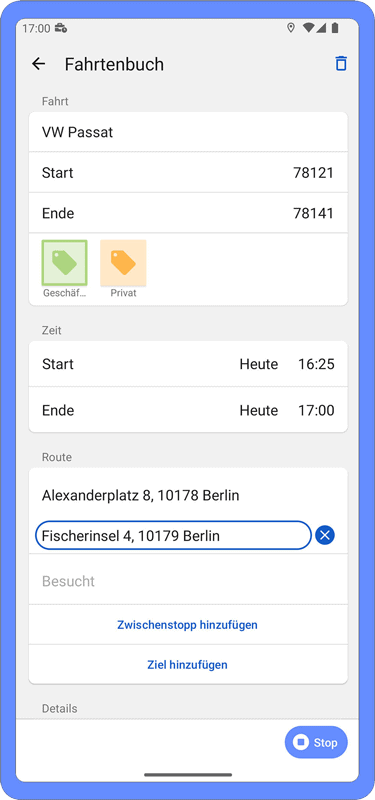Führen Sie ein finanzamtkonformes Fahrtenbuch direkt in der App. Alle Fahrten werden automatisch mit GPS erfasst, ganz ohne manuelle Eingaben.